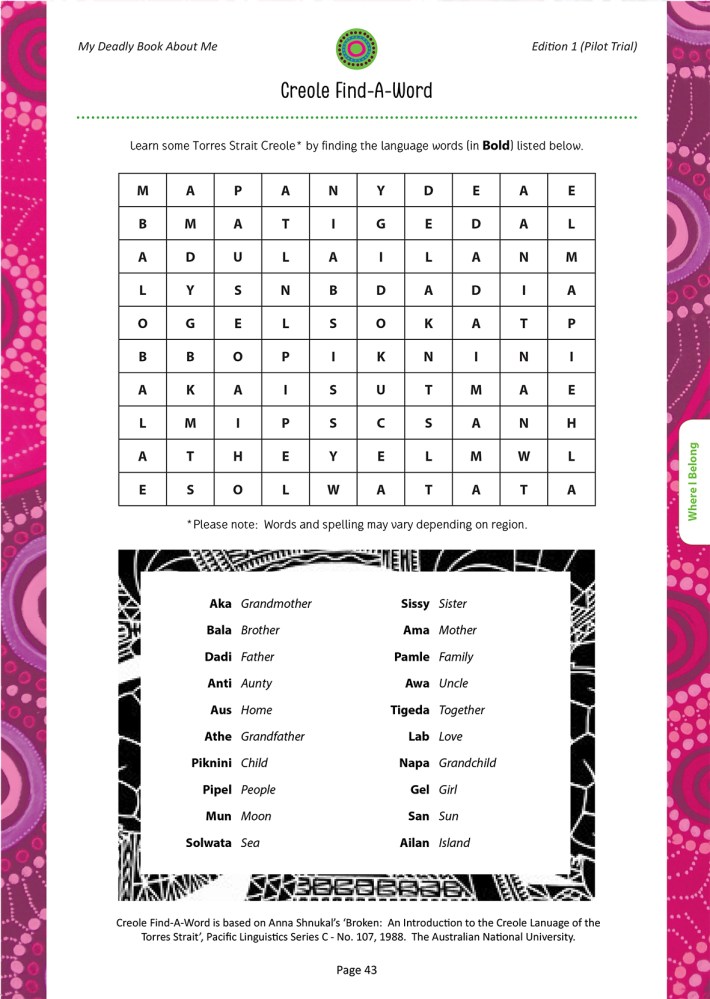 The 57 activity sheets spread across the chapters are interesting, diverse and presented with a unique creative flare that is culturally appropriate and memorable (making finding your place easier). There are a highly engaging and insightful combination of activity sheets that involve researching and recording both written and oral histories, and completing fun tasks that involve connecting with country, family and people in the community.