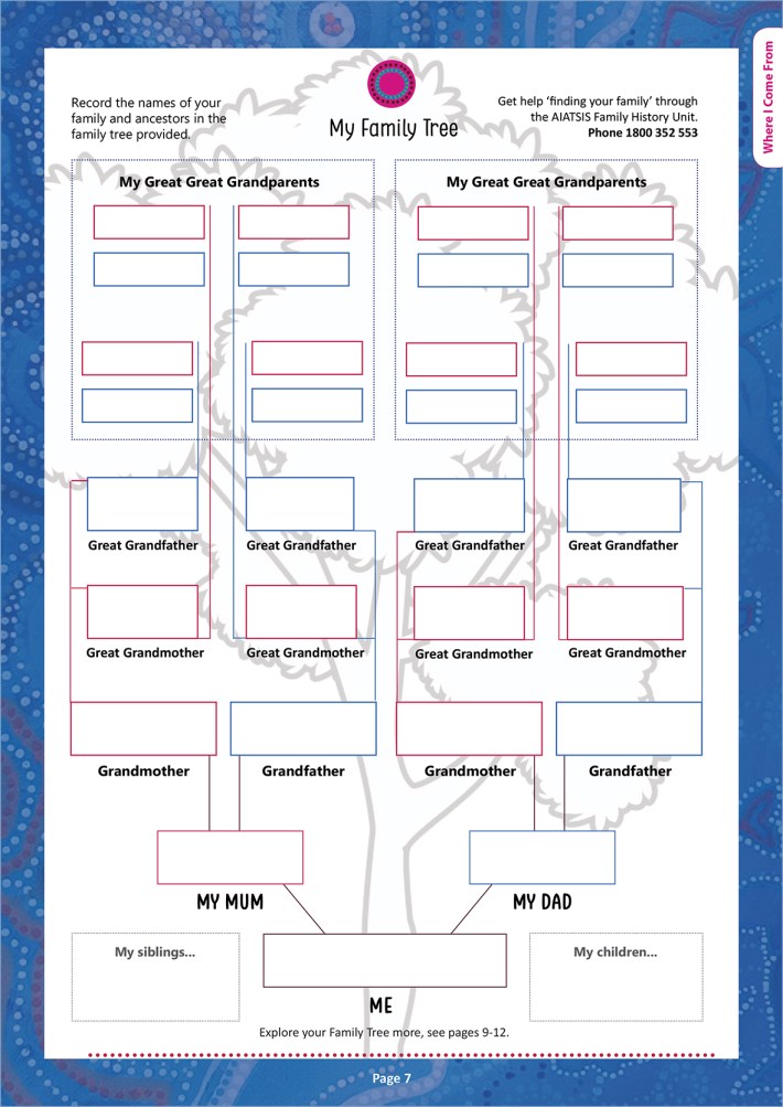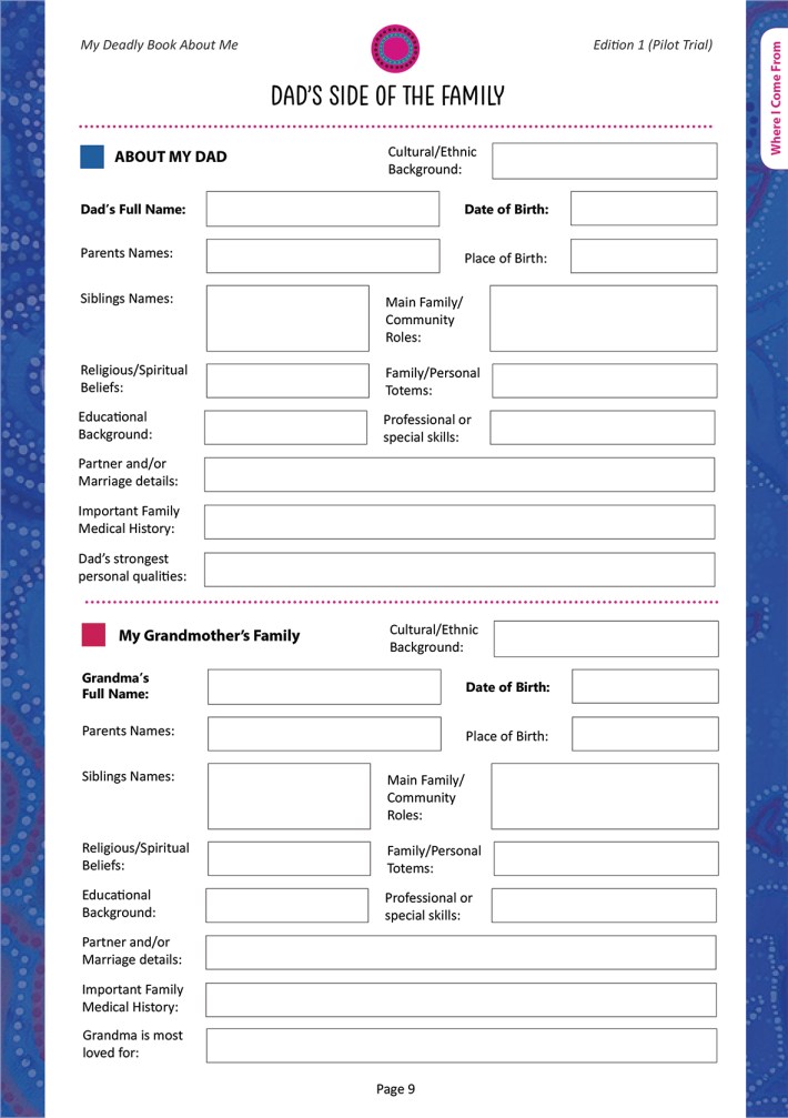 My Deadly Book About Me is a place for individuals to record information that is specific to themselves, their family and their own cultural heritage. The book is a way to preserve and protect local and family histories and maintain strong cultural connections. Through My Deadly Book About Me family members and carers can find common ground, strengthen their relationships and improve their support network.