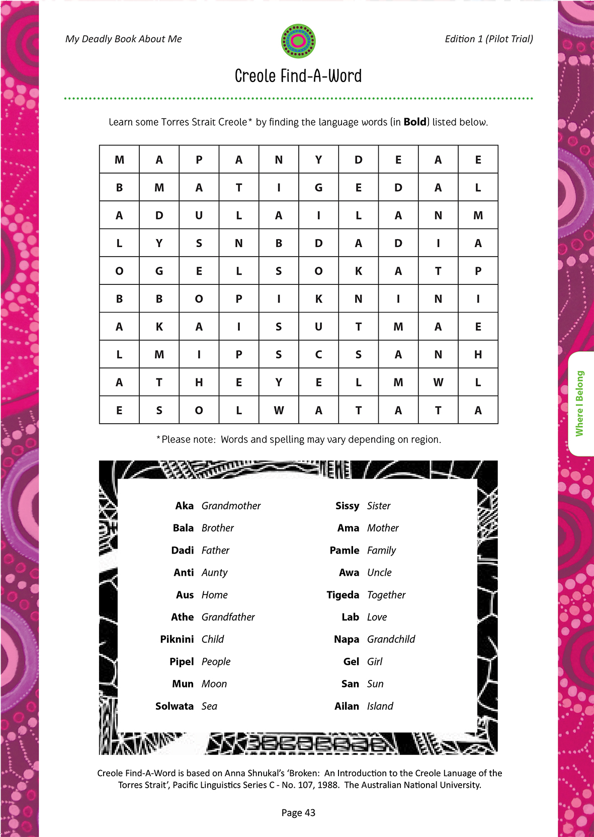 It is not designed as a teaching tool, however it can be used to support Aboriginal and Torres Strait Islander people to build a stronger connection with their cultural identity and family heritage. There are many important community links that are provided in the book, to enrich their journey of discovery.