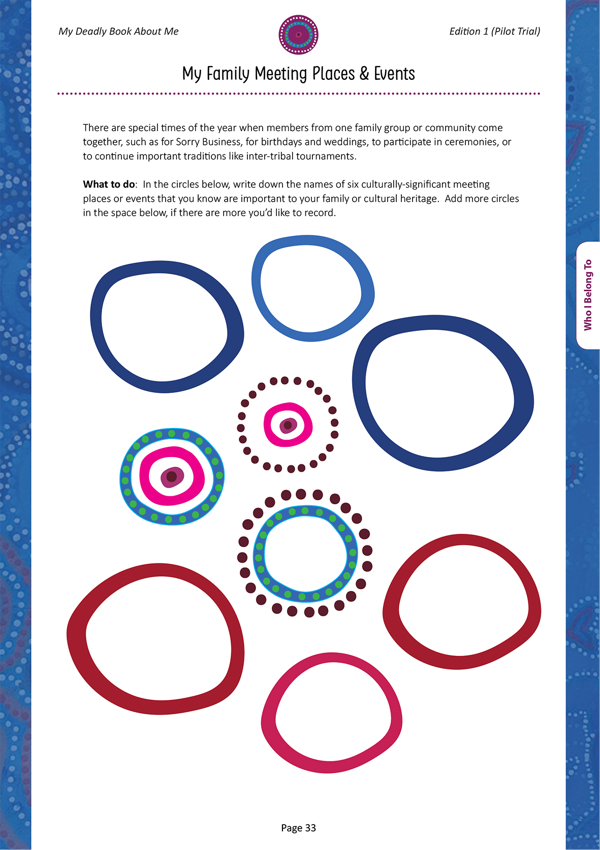 The book is created for individuals of all ages, backgrounds and skill levels who have Aboriginal and/or Torres Strait Islander ancestry. It is a personal book that belongs to an individual, who then decides how much of the information is recorded, and shared or revealed to others.