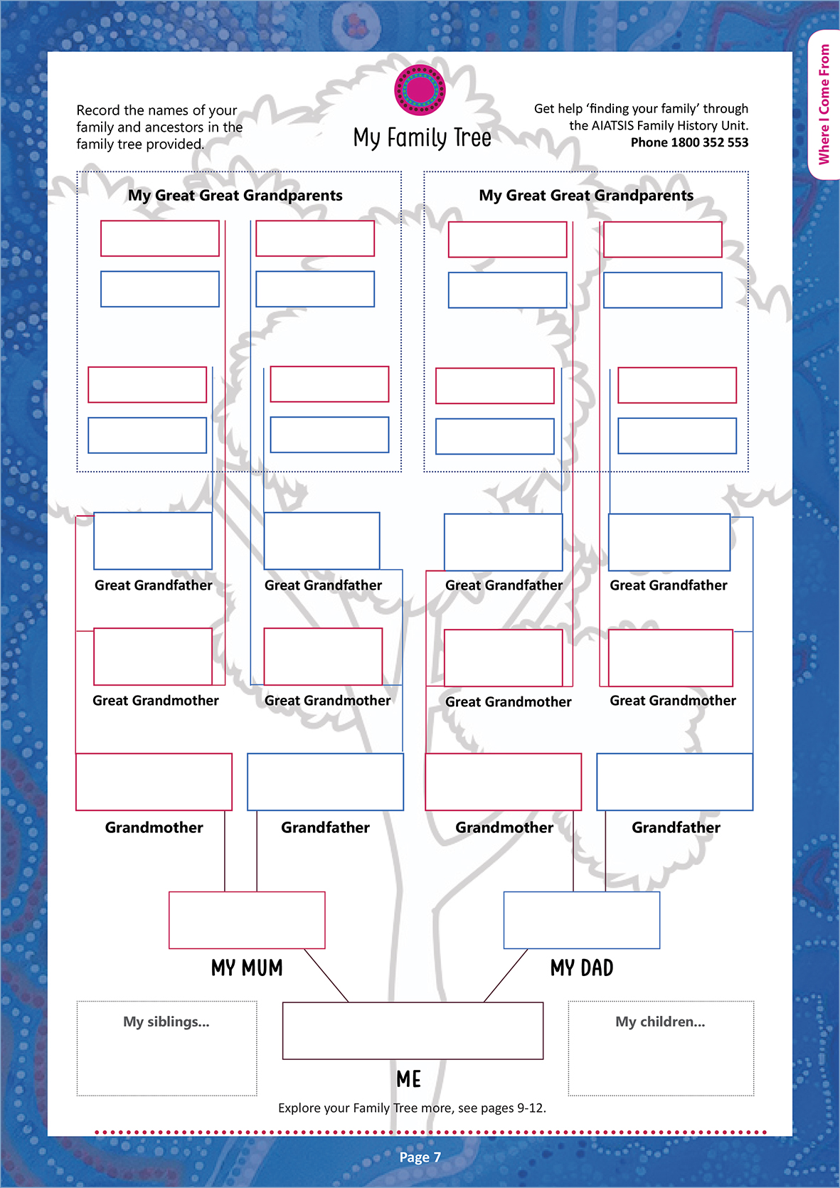 The introductory chapters are an important starting point. From there, it is up to you to choose and start with the pages that hold relevance and meaning to you. The family tree provides a foundation to your research, which you can keep delving in to by recording details about your parents. The cultural protocols list is also an important first step in grounding your research activities.
