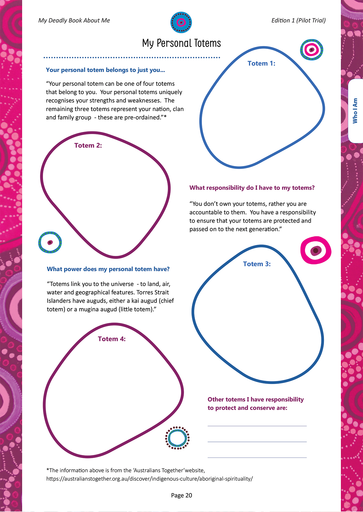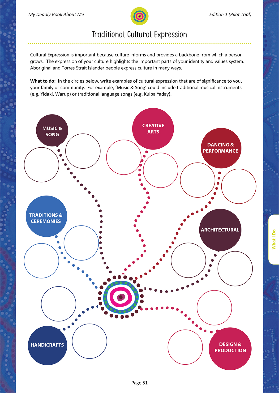 The inside of My Deadly Book About Me is beautifully designed, with each page created to be highly engaging and memorable. Aboriginal and Torres Strait Islander artwork and design features help make the content culturally relevant and appropriate.